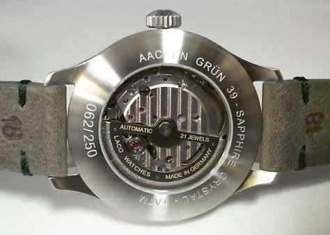 | 【製品仕様】●自動巻(手巻付)(ミヨタ製・21石)(8250)●カレンダー(日付)●ブラッシュ仕上げステンレスケース●カーフベルト(ラグ幅18ミリ)●サファイアクリスタル●スーパールミノバ●日常生活防水●シースルーバック●直径39ミリ(リューズ含まず)●厚さ11ミリ | ||||||||||||