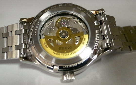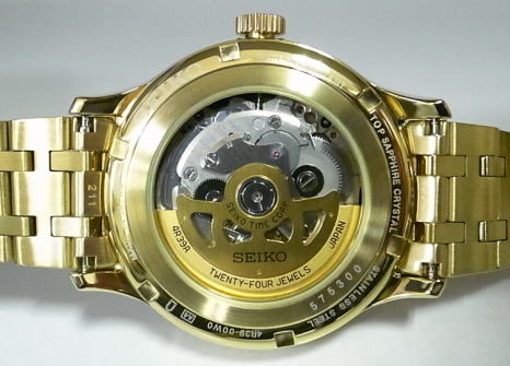 | 【製品仕様】●自動巻(4R71)(手巻付)(秒針停止機能)●金メッキステンレスケース&ブレス(プッシュ両開きバックル●デュアルカーブサファイアガラス●日常生活防水●シースルーバック●直径41,8ミリ(リューズ含まず)●厚さ12,5ミリ●MADE IN JAPAN●定価¥81,400(税込) |